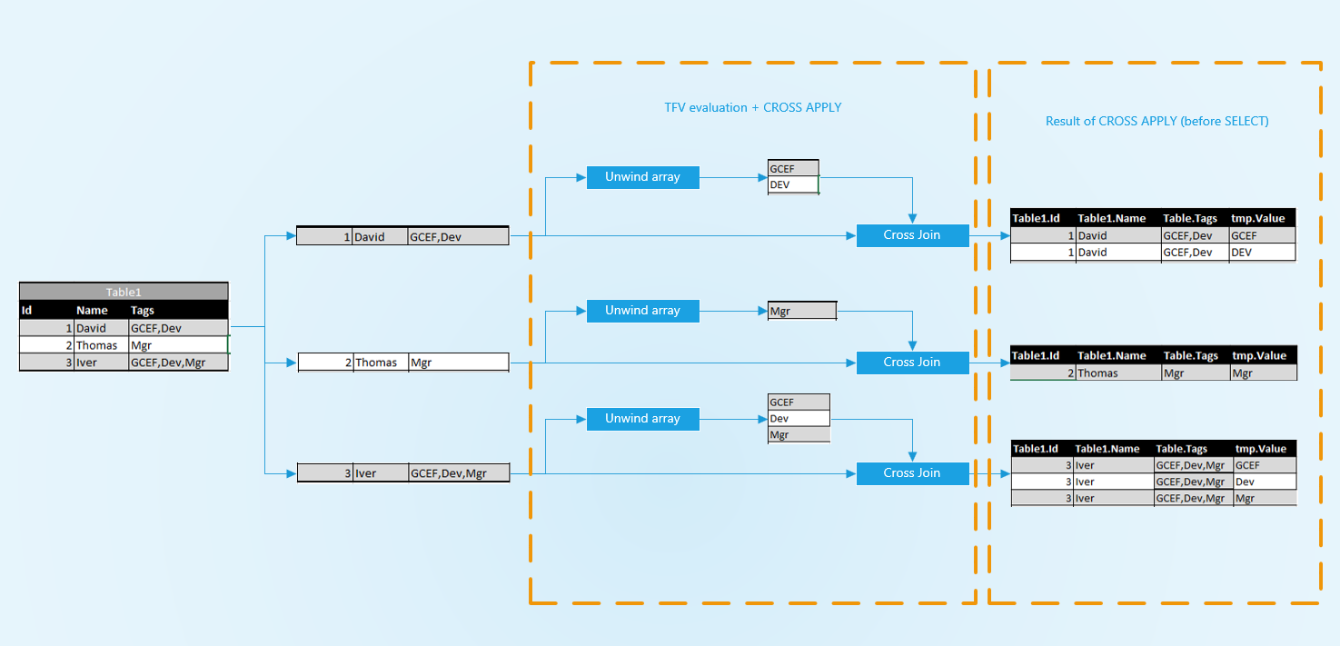 select Table1.Name, tmp.Value as Tag from Table1 cross apply UnwindArray(SPLIT(Table1.Tags,',')) tmp