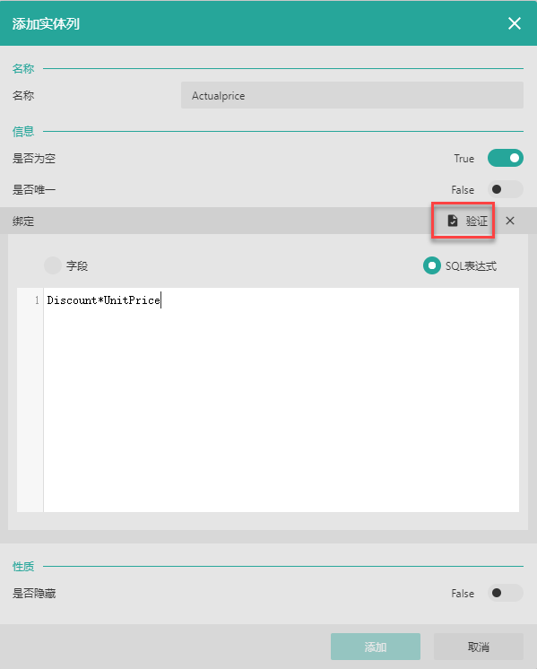 无论是直接引用已有的字段还是通过“SQL表达式”来添加字段,都需要进行验证。验证通过后,右下角的添加按钮才会亮起。