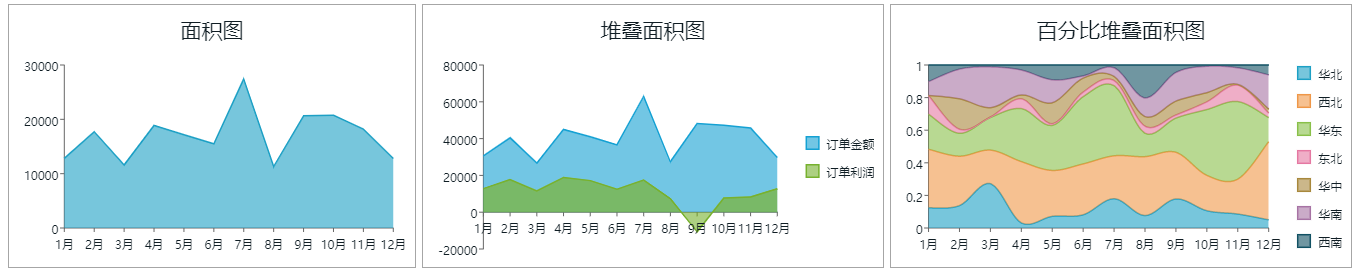 又称区域图,它是在折线图的基础之上形成的, 它将折线图中折线与自变量坐标轴之间的区域使用颜色填充,可以更好的突出趋势信息。