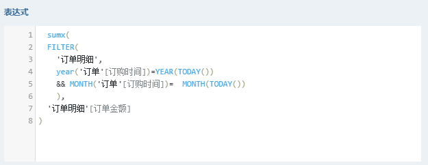 可以在表达式中用YEAR(TODAY()) 取当天所在的年,再月MONTH(TODAY())取当天所在的月份,然后作为filter函数过滤的条件,只过滤出当年当月的订单数据,然后进行汇总SUMX即可。