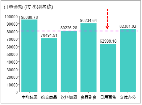 如下图,参考线为销售额的平均值线。这样可以对各类产品的销售额分布情况一目了然。