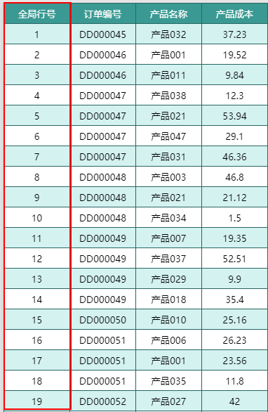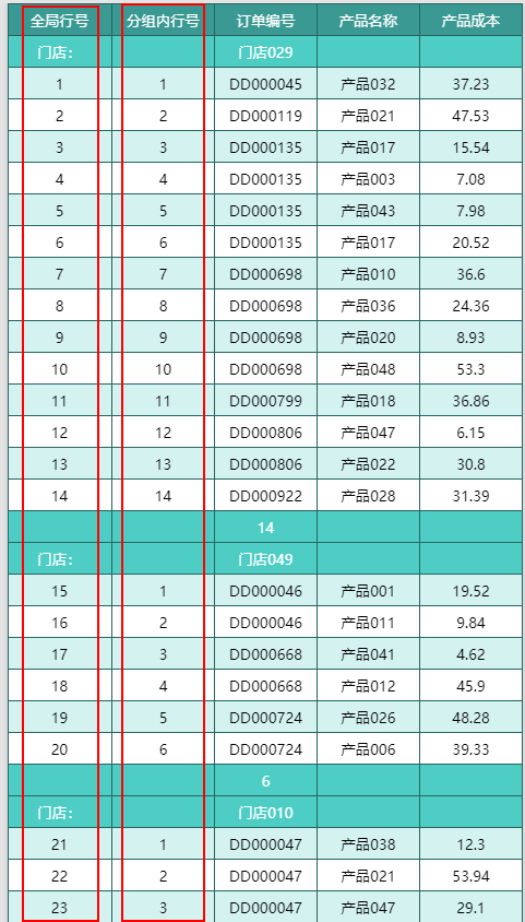 为表格添加行号是实际业务中比较常见的一种需求,对应分组功能,表格行号也支持全局行号和组内行号两种排序方法。如下图所示。
