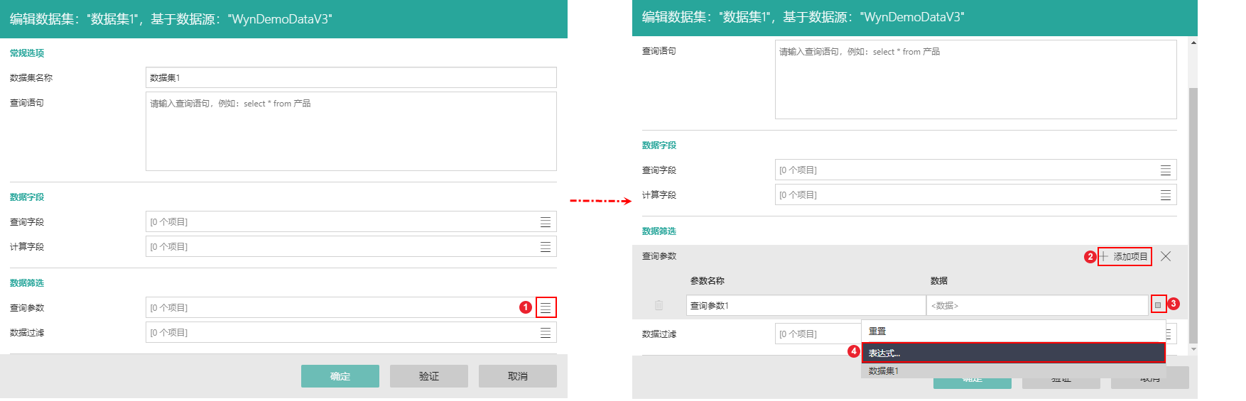 单击数据筛选下“查询参数”右侧的列表按钮。然后单击“+添加项目”添加一个查询参数,单击该参数右侧的小方块图标,选择“表达式”,如下图。
