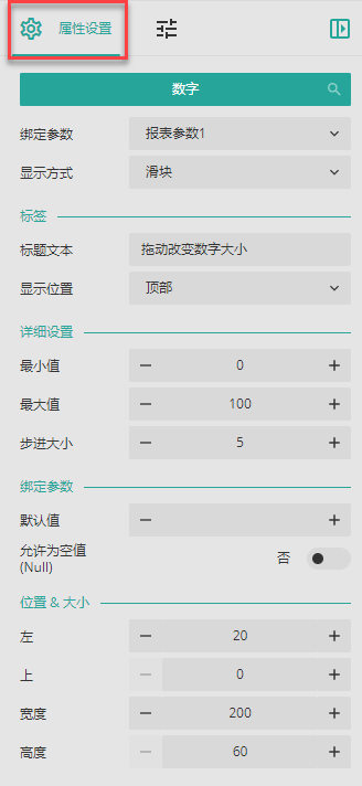 | -- | 显示方式 | 选择数字控件的显示方式为加减按钮或滑块。 无论使用加减按钮还是滑块的方式,数字都是以属性“步进大小”为单位进行变化。 |
