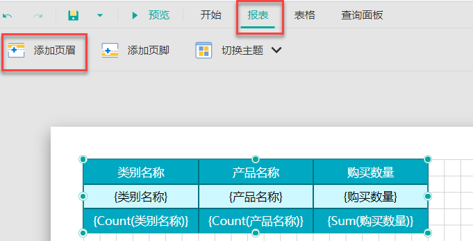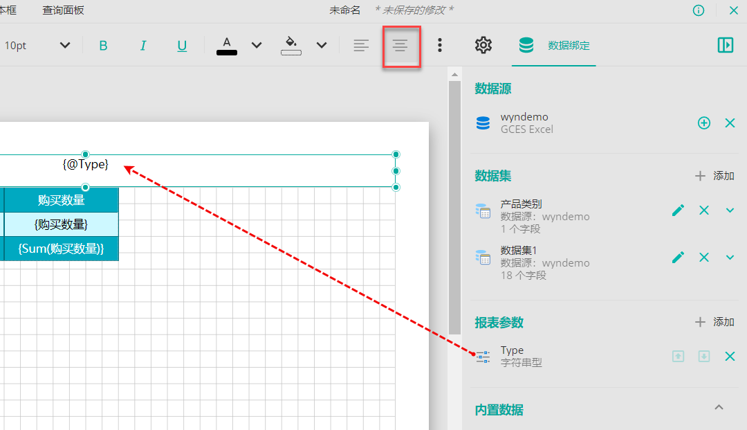 (3) 将报表参数拖拽到页眉区域,并调整文本框大小以及居中方式。
