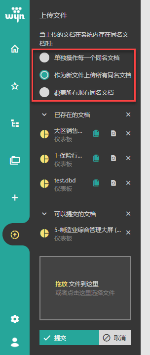 Wyn支持对系统中所有文档类型的上传操作,包括报表、仪表板、数据源、数据集、数据模型、报表模板、图片、地图数据以及主题文件等。