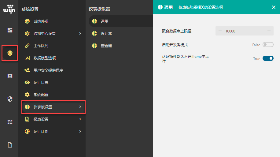 系统设置仪表板设置中可以针对仪表板的设计器,查看器中的一些特性进行设置,使其更符合您的需求和使用习惯。