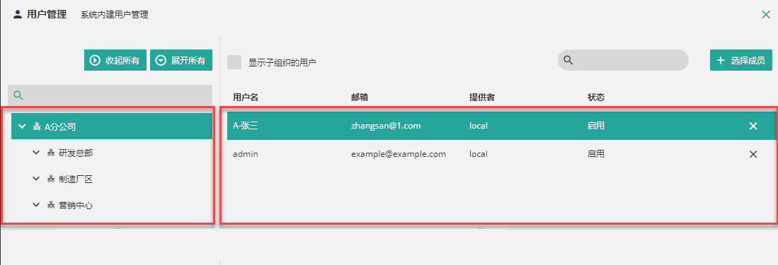 在界面左侧选择组织,在右侧查看该组织的用户信息及状态。