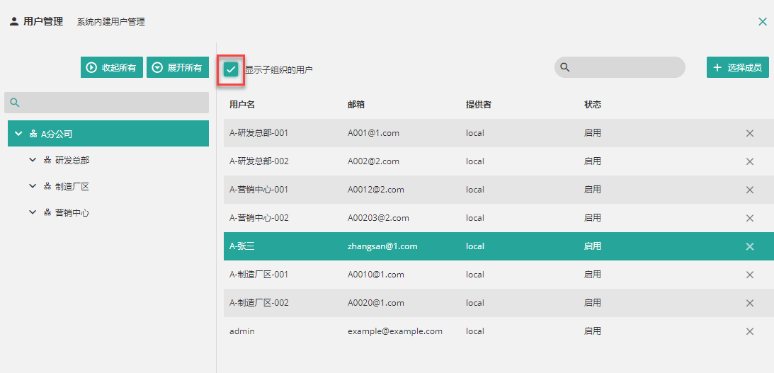 当组织包含子组织时,默认不显示子组织中的用户,如需显示出全部用户,请勾选“显示子组织的用户”。