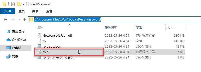 (1) 在Wyn安装目录中找到重置工具 rp.dll(默认路径为:C:\Program Files\Wyn\Tools\ResetPassword)。