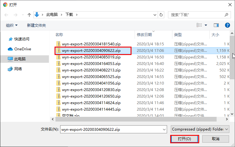 (3) 选择之前导出的压缩包,然后单击“打开”按钮。