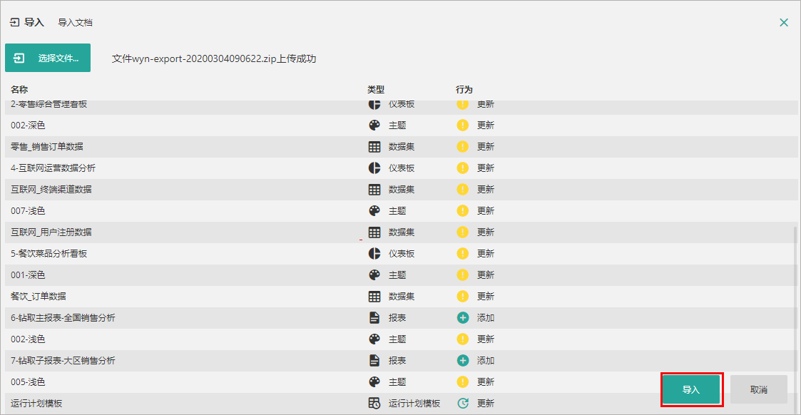 (4) 系统先将压缩包上传,上传成功后将显示文档列表。列表中显示即将导入的文档名称、文档类型以及导入行为。