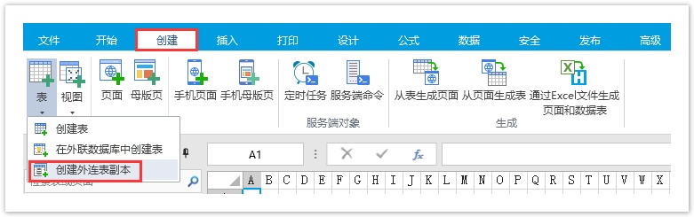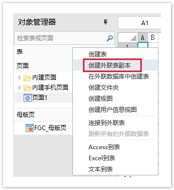 或在对象管理器的表标签上右击,选择右键菜单中的“创建外联表副本”。