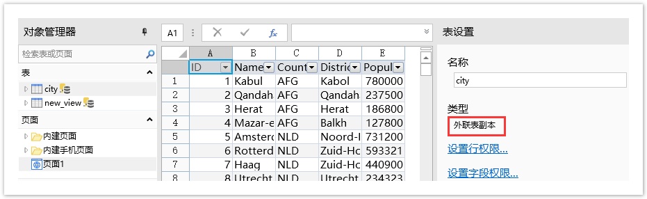 单击“确定”,即可创建选择的表或视图的外联表副本。在设计器中打开该表或视图,在表设置中可看到其类型为“外联表副本”。