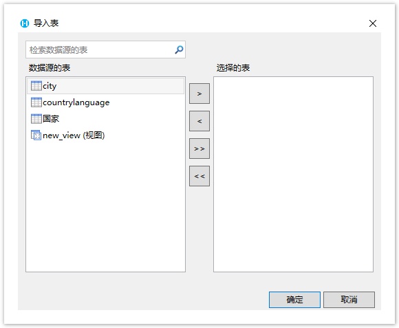 单击“确定”后,弹出“导入表”对话框,在数据源的表列表中选中要导入的表或视图,单击“>”将选中的表或视图移到选择的表列表,或单击“>>”将数据源的表或视图全部移到选择的表列表中。