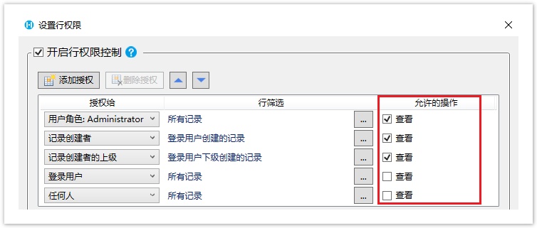 在行权限和字段权限的设置中,只能设置允许的操作为查看。
