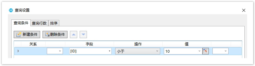 例如,设置查询条件为ID字段小于10。