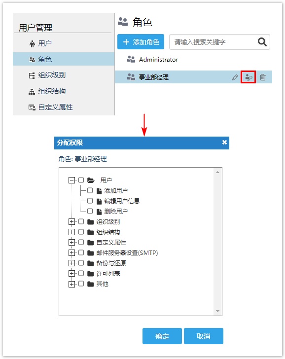 在管理控制台中,只有用户Administrator可以给不同的角色分配不同的权限,以限制不同的角色在管理控制台中可以进行的操作。