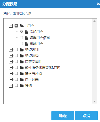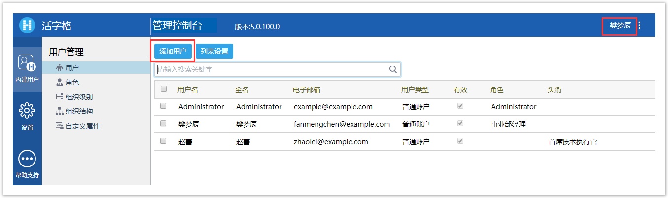 使用角色为事业部经理的用户登录管理控制台,如用户樊梦辰登录,则该用户只能看导添加用户的按钮,即只有添加用户的权限,如下图所示。