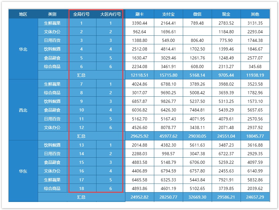 在“销售大区”和“销售省份”左侧各增加一列,用于显示全局行号和组内行号。
