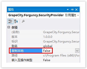 选中“GrapeCity.Forguncy.SecurityProvider.dll”文件,右击选择“属性”,将“复制到本地”改成“False”。