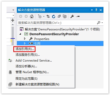 在解决方案资源管理器中的“引用”上右击,选择“添加引用”。