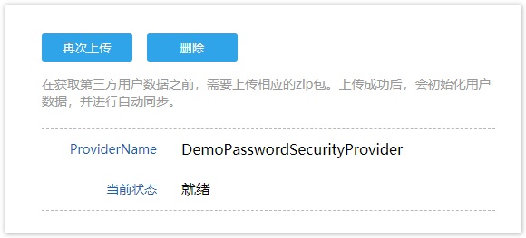 在用户账户管理界面的“第三方”区域,单击“上传”,选择安全提供程序.zip打包文件即可。