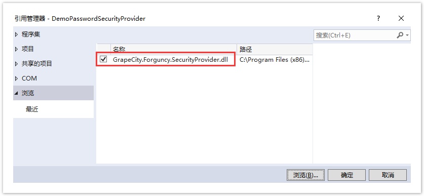 单击右下角的“浏览”,在活字格的安装目录下找到“GrapeCity.Forguncy.SecurityProvider.dll”文件并将其添加为该工程的引用。