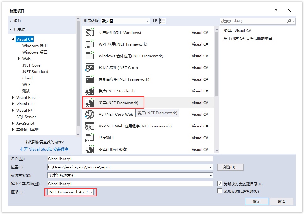 在Visual Studio中创建类库项目。设置项目的Framework框架为.NET Framework 4.7.2。如图1所示。