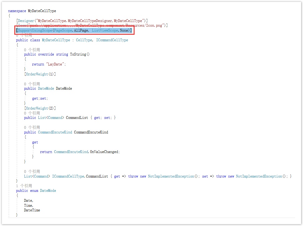 例如,如果你想单元格类型插件或插件的属性只可用于PC页面或PC母版页面的单元格中,您可以为单元格类型插件或插件的属性添加SupportUsingScope特性,如下: