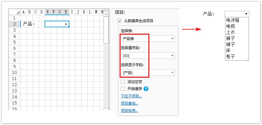 设置单元格为组合框,勾选“从数据库生成项目”,选择数据表、值字段、显示字段。单击“下拉子项目”设置子项目,如下图所示。