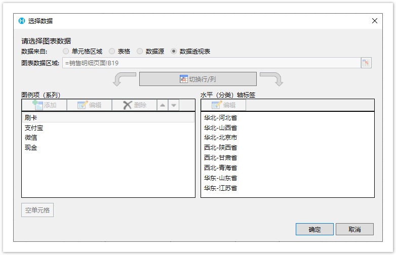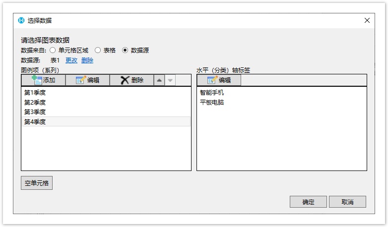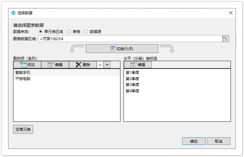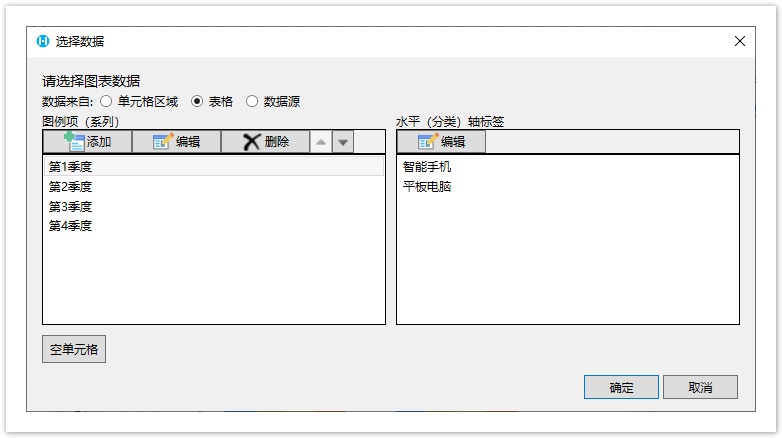 图例项(系列):添加、编辑、删除、上移或下移图例项(系列);以数据表为数据源时,只能选择数据源中的一列作为系列数据。