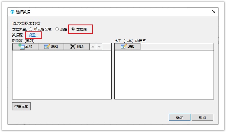 在选择数据对话框中,数据来自选择“数据源”,然后单击数据源后的“设置”,弹出如下对话框: