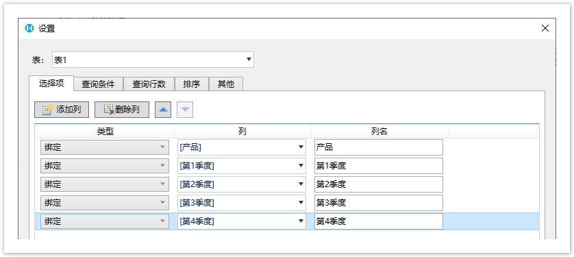 选择要设置为图表数据源的数据表后,您可以设置选择项、查询条件、查询行数、排序和其他设置。