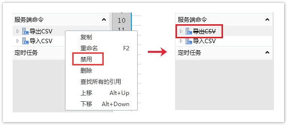 选择一个服务端命令,右击,弹出右键菜单,单击“禁用”就会将此服务端命令更改为禁用,服务端命令的名称上就会有一道删除线。禁用后,您仍然可以调用这个命令,但是不会执行。