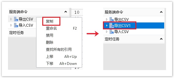 在对象管理器中,选择一个服务端命令,右击,弹出右键菜单,单击“复制”就会复制出一个服务端命令,您可以对其进行编辑等操作。
