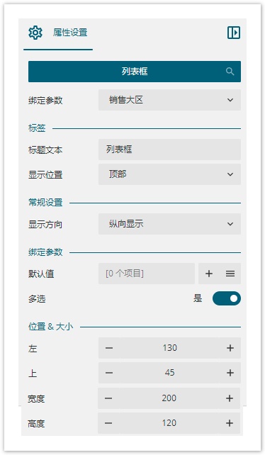 位置&大小 | 左、上、宽度、高度 | 请参见查询控件中的“控件通用属性”。 |