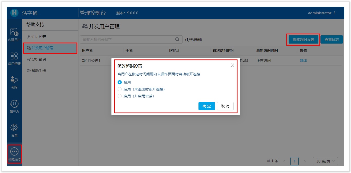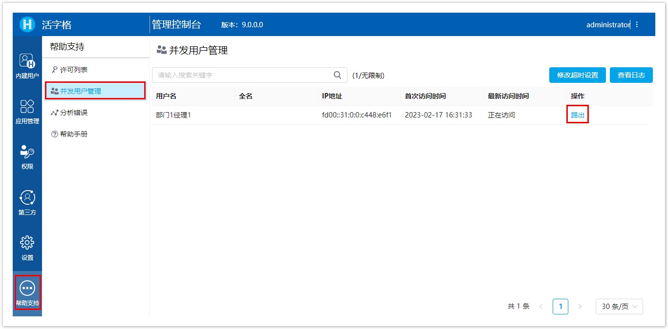 管理用户登录状态。所有用户都会在“帮助支持->并发用户管理”页面中列出,管理员可以单击“踢出”来强制踢出任何登录用户。用户被踢出后,需要重新登录应用。
