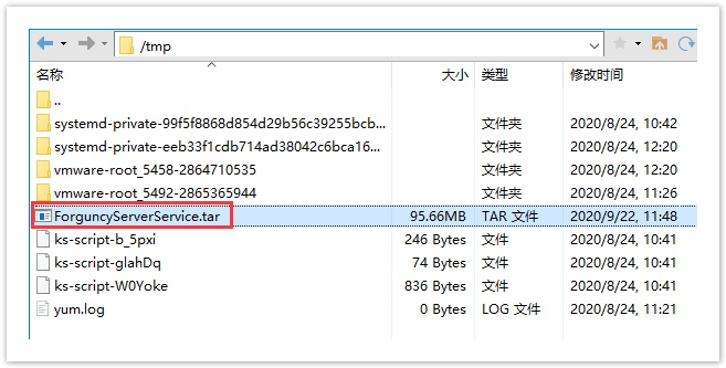 下载活字格服务端的Linux安装包“ForguncyServerService.tar”后,使用文件传输软件如xFTP将安装包保存到Linux系统的机器上,如保存到tmp文件夹下。