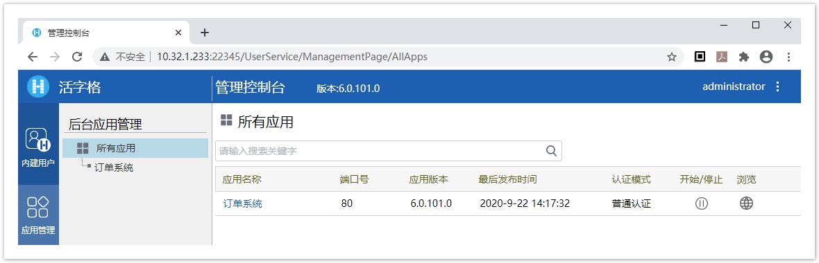 登录安装在Linux上的活字格管理控制台,可以看到发布的活字格应用。您可以对应用进行管理。