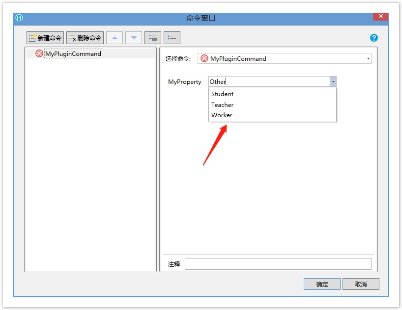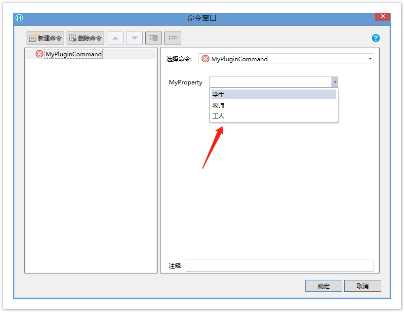 public class MyPluginCommand : Command { [ComboProperty(ValueList = "Student|Teacher|Worker", DisplayList = "学生|教师|工人")] public string MyProperty { get; set; } }