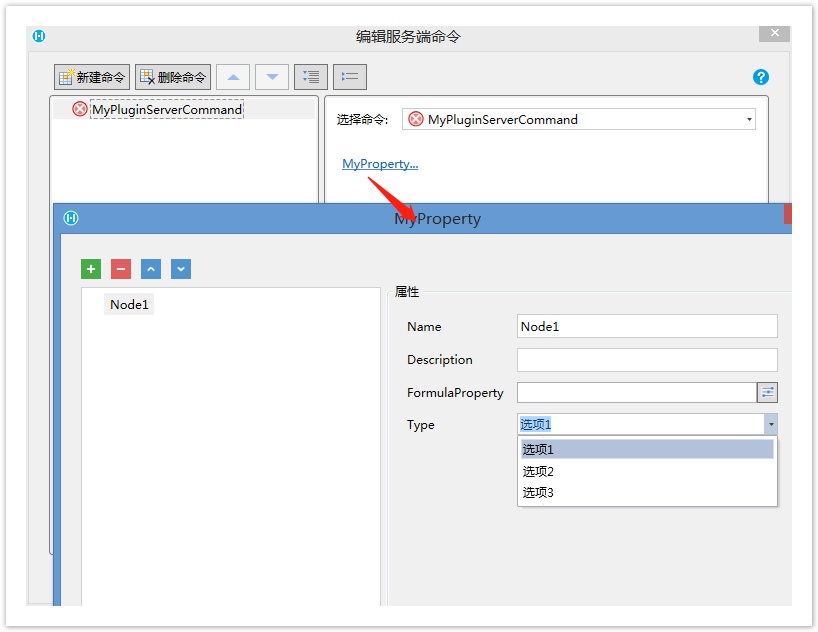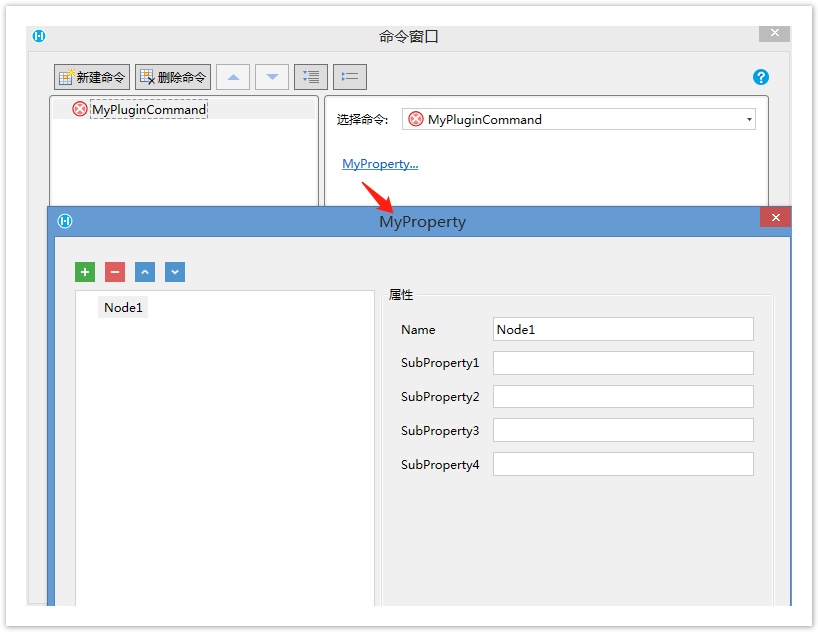 public class MyPluginServerCommand : Command, ICommandExecutableInServerSideAsync { [ObjectListProperty(ItemType = typeof(MyObj), DefaultName = "结点")] public List<INamedObject> MyProperty { get; set; } = new List<INamedObject>(); public async Task<ExecuteResult> ExecuteAsync(IServerCommandExecuteContext dataContext) { return new ExecuteResult(); } public override CommandScope GetCommandScope() { return CommandScope.ExecutableInServer; } } public class MyObj : ObjectPropertyBase, INamedObject { public string Name { get; set; } public string SubProperty1 { get; set; } public string SubProperty2 { get; set; } public string SubProperty3 { get; set; } public string SubProperty4 { get; set; } }