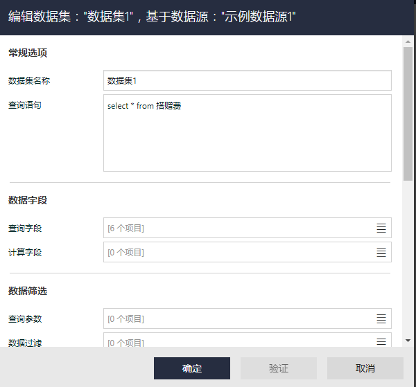 点击【验证】按钮,确认SQL语句的正确性,再点击【确定】按钮,保存数据集的定义。
