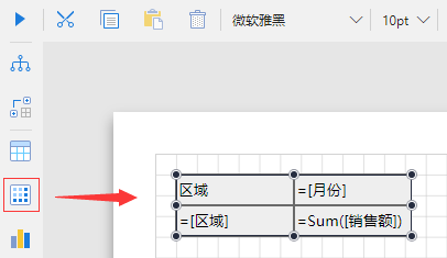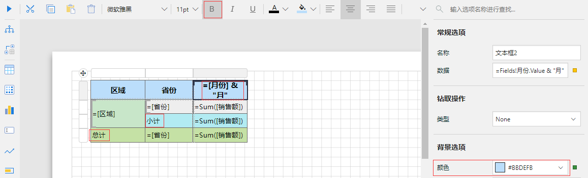 次行第二个单元格用于绑定字段,展示数值型数据,此处请绑定【销售额】字段的汇总表达式: =Sum([销售额])。