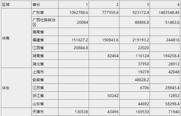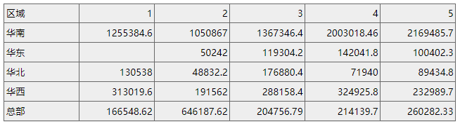可以看到,每个区域内的省份,都会作为一行显示,行内的数字,则是按照【省份】这个新的分组,汇总某个月份的销售额得到的数值。