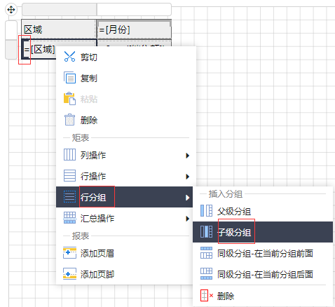 数据分组可以有多级,比如在区域下面,以【省份】作为子分组,可右键单击分组单元格,选择【行分组】-【子级分组】,如下图: