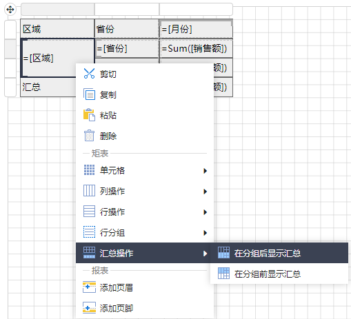 表格内常见的合计值,使用【汇总操作】实现。右键单击【区域】,选择【汇总操作】-【在分组后显示汇总】,矩表将增加【汇总】行,如下图: