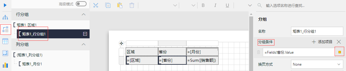 点击工具箱上部的【分组管理】,展开分组树形目录,选中新添加的行分组【矩表1_行分组1】,在右边栏中添加分组条件,使用小方框图标弹出字段列表,选中【省份】,如下图: